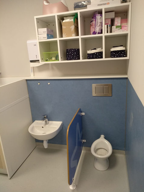 une salle d'eau : 2 plans de change (dont 1 avec escalier amovible), lavabo à hauteur d'enfant, toilette enfant